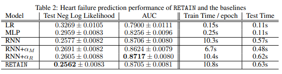 위의 결과를 보면 알 수 있듯이 RETAIN이 다른 방법론들에 비해 성능이 뛰어나진 않습니다. 하지만 RETAIN은 다른 방법론들과 달리 결과에 대한 해석이 가능하므로, 다른 방법론들의 성능을 유지하면서 설명력을 갖는다는 점이 큰 장점입니다.