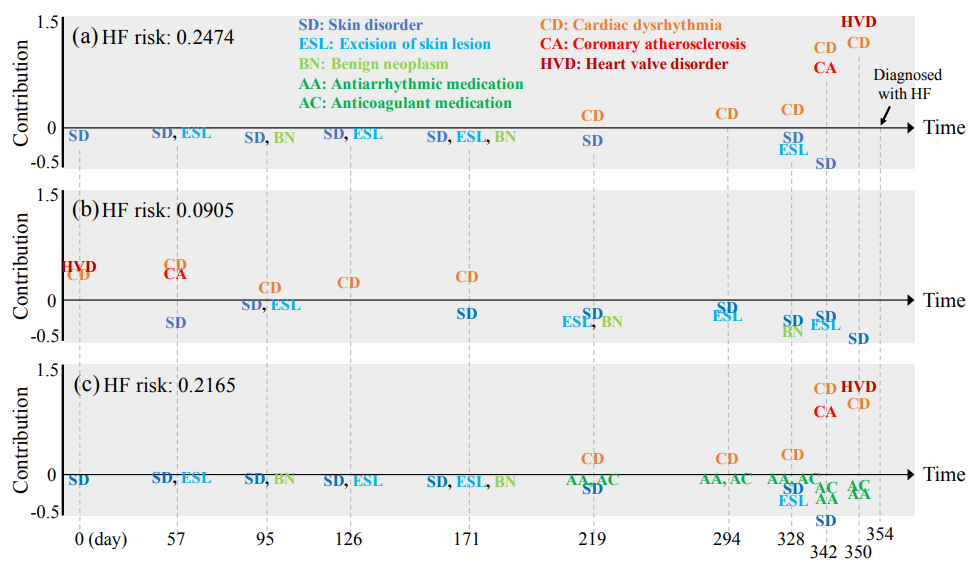 (c)는 test input sequence에 HF의 증상인 CD에 대한 약인 AA와 AC를 특정 시간에 처방하였다고 가정한 데이터를 입력한 결과 입니다. 보시다시피 AA와 AC의 contribution은 음수로 HF 진단확률을 낮추게끔 영향을 주고 실제 진단 확률도 (a)의 0.2474보다 낮은 0.2165를 얻었음을 확인 가능합니다.