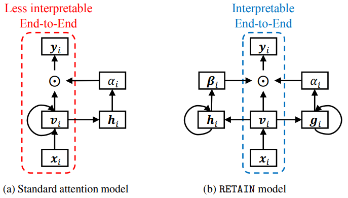 크게 embedding vector $v_i$를 만드는 부분$\cdots$(ㄱ)과 attention weight를 만드는 부분$\cdots$(ㄴ)으로 나눈다고 할때, 일반적인 모델은 (ㄱ)에서 RNN , (ㄴ)에서 MLP를 사용하는 반면 RETAIN에서는 (ㄱ)에서 MLP, (ㄴ)에서 RNN을 사용함을 확인할 수 있습니다. RNN에서는 recurrent한 weights가 과거의 정보를 hidden layer에 반복적으로 제공하는 특징을 가지고 있습니다. 따라서 일반적인 모델에서는 embedding vector $v_i$를 형성하는데 input $x_i$가 어떻게 작용하는지를 파악할 수가 없는 반면 RETAIN에서는 MLP를 통해 embedding vector를 형성하기 때문에 input $x_i$가 어떻게 작용하는지를 파악이 가능하다고 설명하고 있습니다.